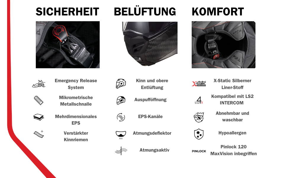 • SAFETY: Micrometric Metal Buckle. Reinforced Chin Strap. Emergency Release System. Reflective Safety Patch with Magnetic Smart Pull-Tab. Pre-Fitted LS2 4X Intercom