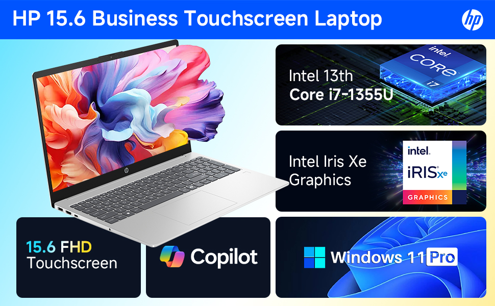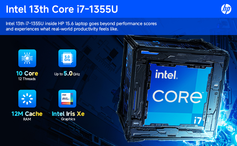 Detail- Intel 13th 10-Core i7: The HP 15.6' laptop with i7-1355u is designed to exceed expectations. The Intel 10-Core i7 1355U processor, reaching up to 5.00 GHz Turbo Boost and having 12MB cache, gives you the power to crush deadlines. This touchscreen laptop, a great example of hp laptops, is perfect for multitasking, handling data-intensive apps, and running business software, standing out among 15 inch laptops