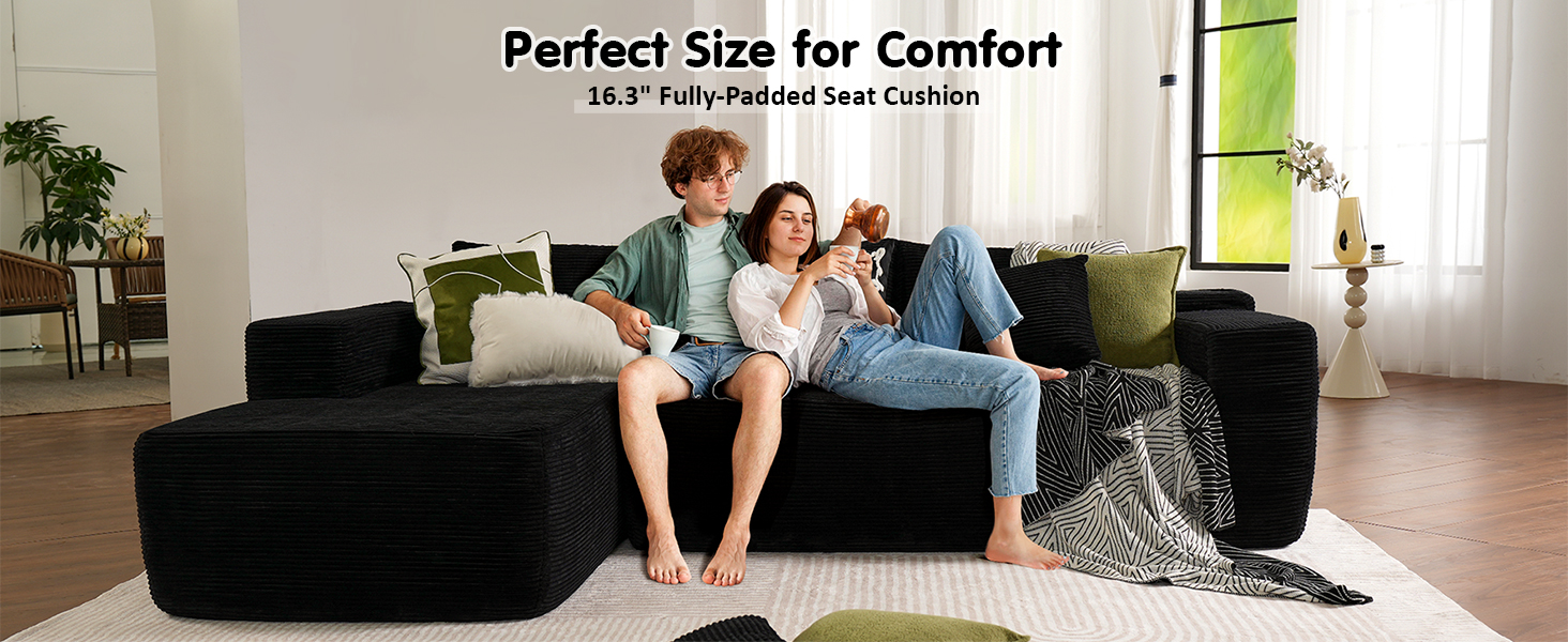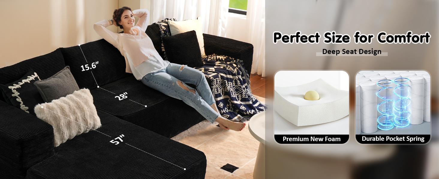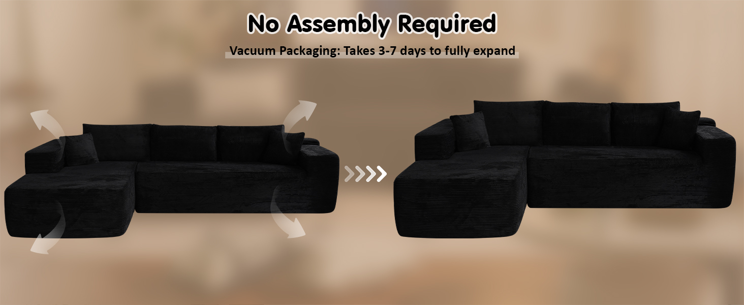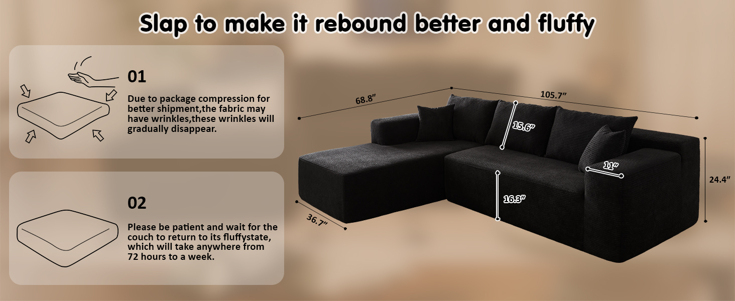 Brand Name ovios Sofa Type Sofa Chaise Room Type Guest Room, Bedroom, Living Room, Home Office, Playroom Collection Name L-Shape Couch Age Range Description Adult Number of Pieces 2 Indoor Outdoor Usage Indoor Orientation Right Hand Facing Included Components Throw Pillow Manufacturer Grade A Recommended Uses For Product Living Room, Guest Room, Home Office, Playroom, Bedroom, Movie Night, Overnight Guest Accommodation Included Throw Pillow Quantity 5 Weight Capacity Maximum 1200 Pounds (544.31 kg) Seating Capacity 4 Additional Features No Assembly Required, Spring Cushion, Tool Free Assembly, Lightweight Construction, Deep Seat Item Firmness Description Medium Frame Joint Type Butt Joint Seat Cushion Configuration Multiple Cushion Seat Is Customizable? No Is Electric No Upholstery Fabric Type Corduroy Frame Material Type No Frame Material Type Foam, Pocket Spring, Cotton Has Removable Seat Cushion Cover false Product Care Instructions Wipe with Damp Cloth, Wipe Clean with Dry Cloth Seat Fill Material Cotton Furniture Leg Material No Leg Seat Back Fill Material Foam, Cotton Back Cushion Removability Removable Seat Cushion Removability Attached Fill Material Polyester, Foam, Pocket Spring, Cotton Material Features luxurious and comfortable Included Throw Pillow Cover Material Corduroy Included Throw Pillow Fill Material Cotton,Foam Required Assembly No Component Connector Assembly Not Required Includes All Assembly Tools No Seat Depth 25.6 inches (65 cm) Seat Height 14.5 Inches (36.8 cm) Item Dimensions D x W x H 69.2'D x 106'W x 24'H (175.8 x 269.2 x 61 cm) Item Weight 71.5 Pounds (32.43 kg) Size Right Facing Chaise Seat Back Interior Height 15.74 Inches (40 cm) Minimum Required Door Width 18 Inches (45.7 cm) Arm Height 😍Click 'Add toh Cart' to get your😍